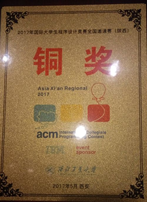 2017年5月20日至21日,ACM国际大学生程序设计竞赛全国邀请赛在陕西省西安市西北工业大学举行。经过5个小时激烈角逐,由我校软件学院软件工程专业2015级董全、2015级夏腾溪、2015级周金林组成的代表队(指导教师于波)荣获铜奖。