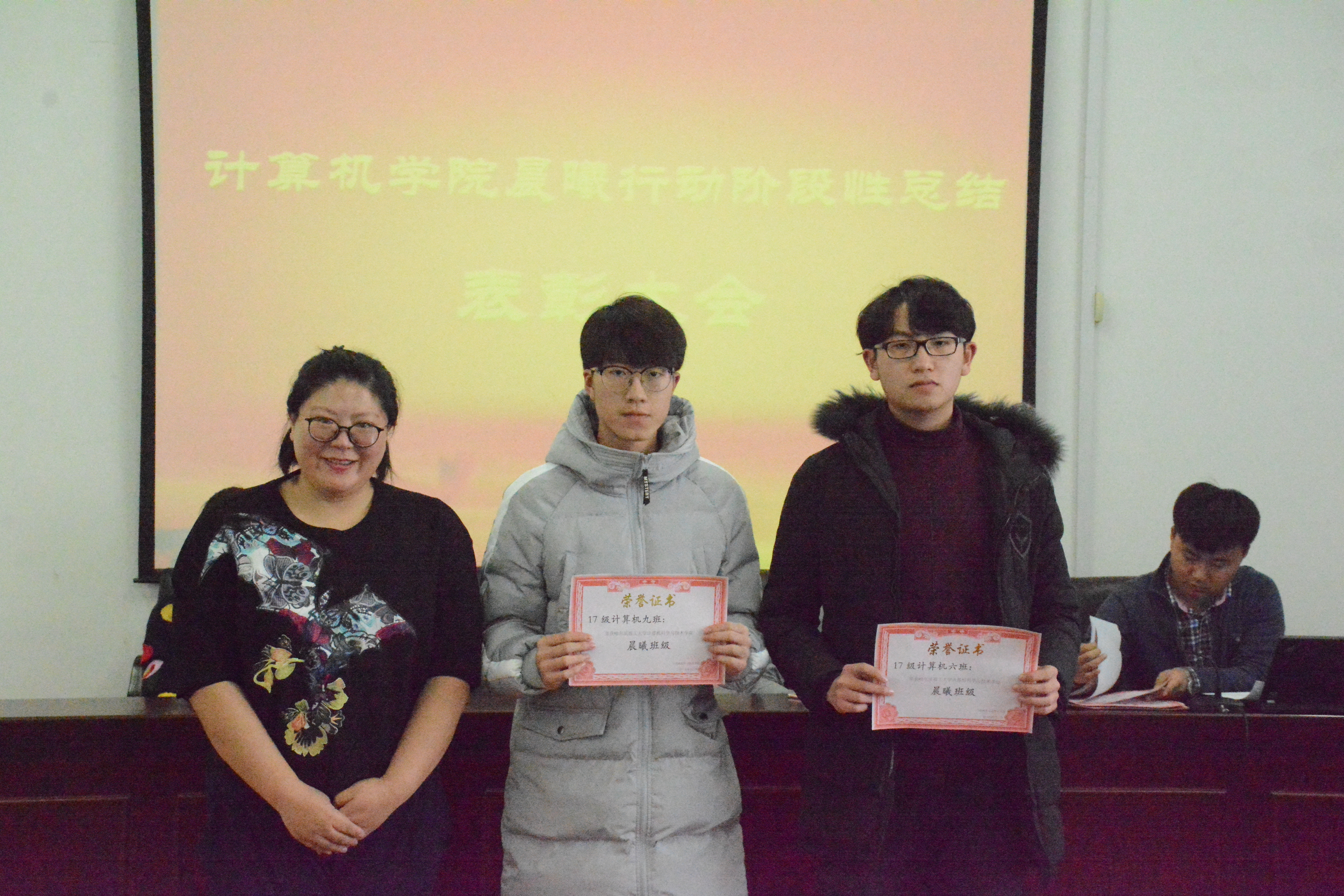 会上首先总结了本学期我院2017级新生晨曦行动的开展情况,表彰了徐昊等33名在晨曦行动中表现优异的学生,并授予他们“晨曦之星”的称号,以及在晨曦行动中整体出勤情况和学生参与度最好的计算机17-6班和计算机17-9班两个“晨曦班级”。同时也表彰了一批在11月末学院举行的晨曦雪地趣味运动会上获得奖项的班级和个人。