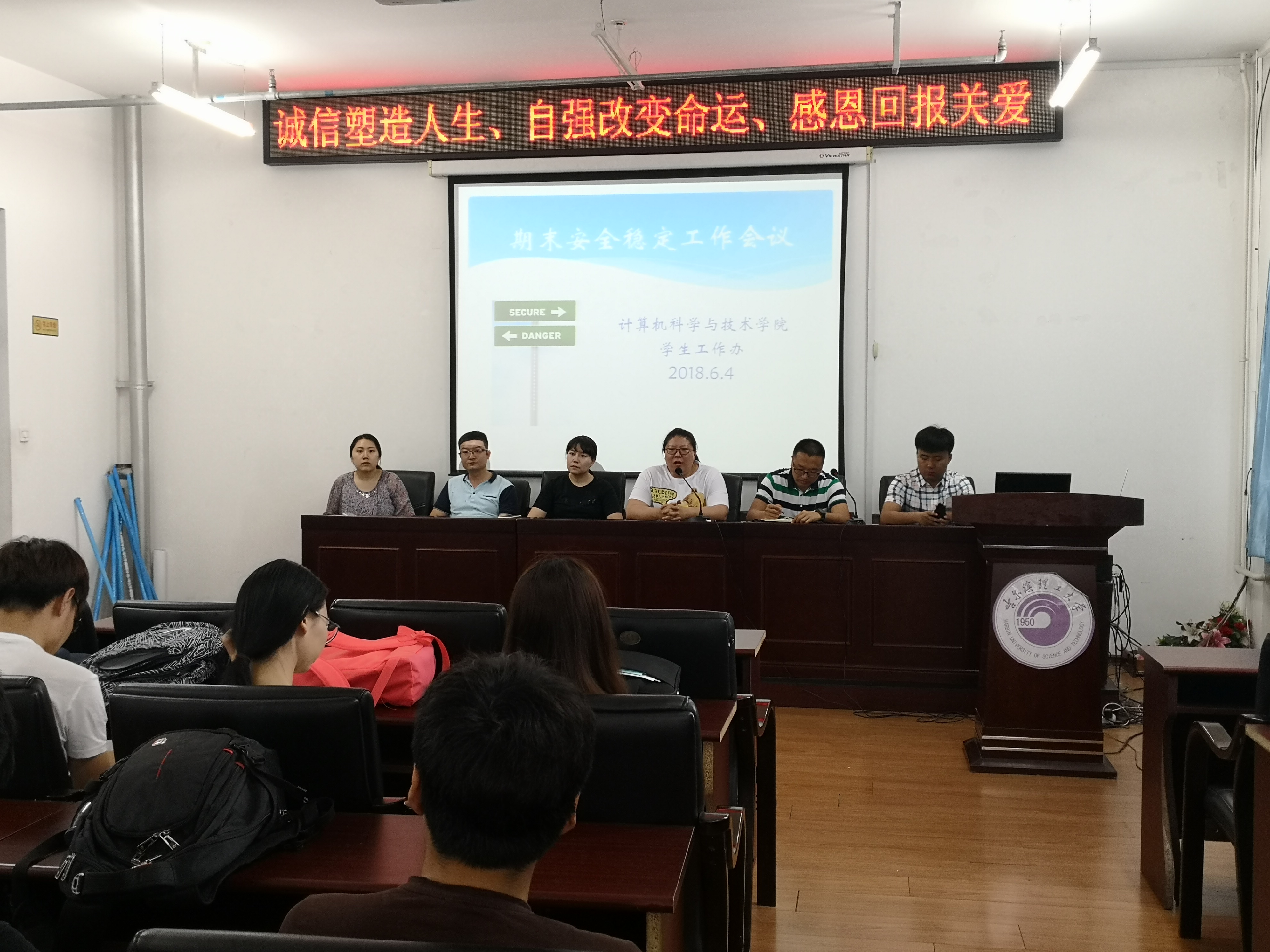 期末考试将近,计算机科学与技术学院于6月4日召开学生工作会议,贯彻党委学工部的近期工作安排。院党委副书记刘坤雁从晨曦行动、无手机课堂、考风考级、网络舆情、寝室安全、毕业生工作等几个方面进行了总结和部署,全体辅导员及各年级主要学生干部参加了会议。
