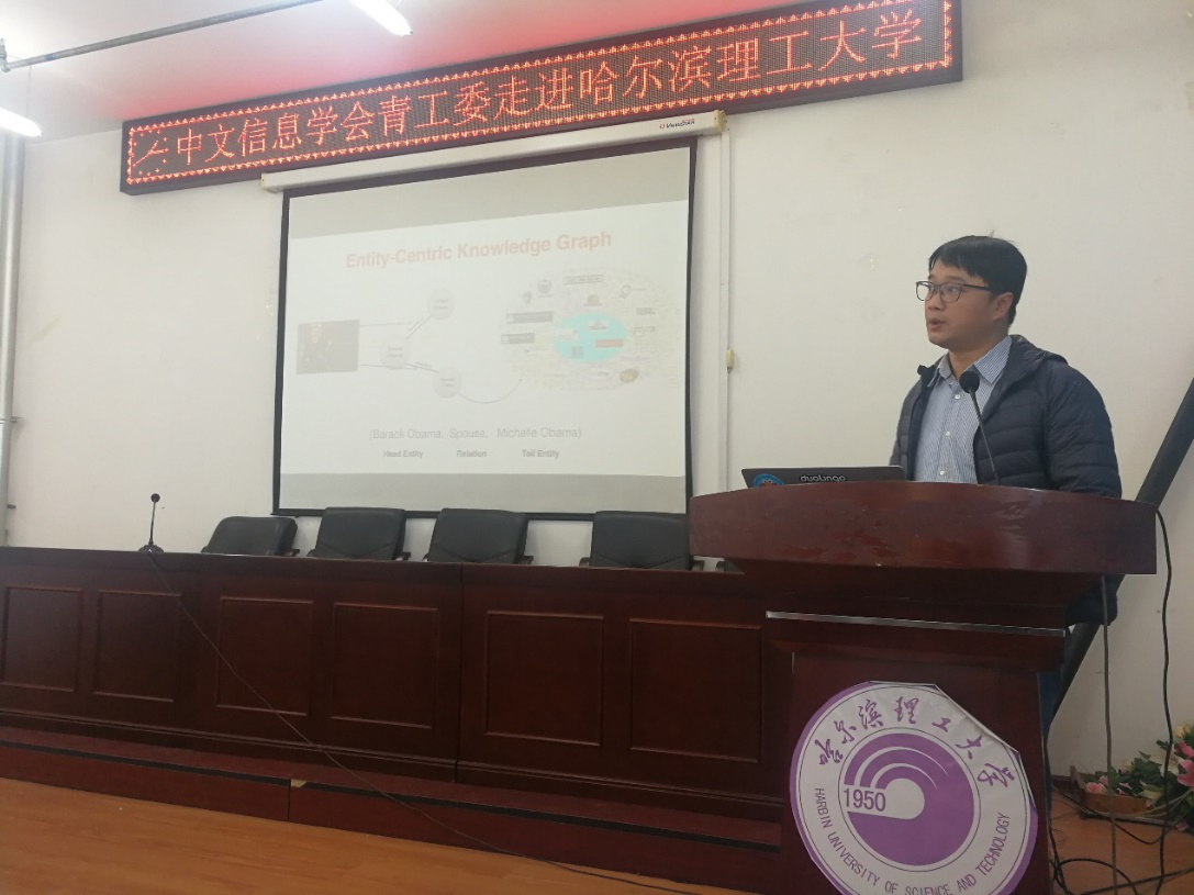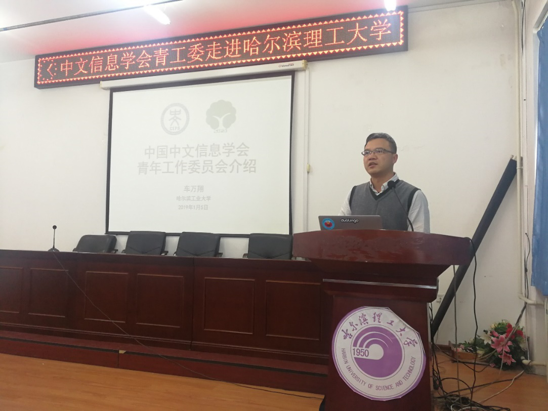 报告会由孙广路教授主持,首先介绍了会议的主题及背景,三位讲者的简历,并简要介绍哈尔滨理工大学及计算机科学与技术学院的基本情况。孙广路教授代表学校和学院欢迎三位优秀青年学者来校访问讲学,同时感谢中国中文信息学会访问哈尔滨理工大学。然后由来自哈尔滨工业大学的博士生导师车万翔教授介绍中文信息学会青年工作委员会及其相关活动。