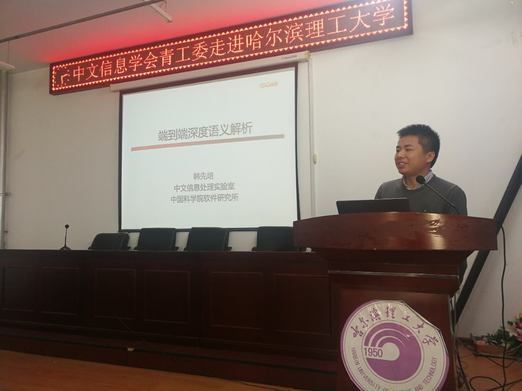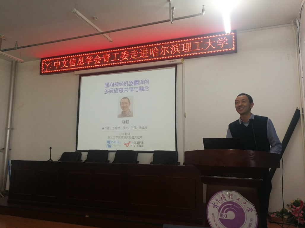 应计算机学院副院长孙广路教授的邀请,中科院自动化所模式识别国家重点实验室刘康副研究员、东北大学自然语言处理实验室副主任肖桐副教授、中科院软件所计算机科学国家重点实验室韩先培研究员分别进行了深度学习、神经计算等人工智能方法的学术报告。报告会共有来自哈尔滨工业大学、哈尔滨工程大学、黑龙江大学、黑龙江工程学院和哈尔滨理工大学等高校的70余名师生参加。