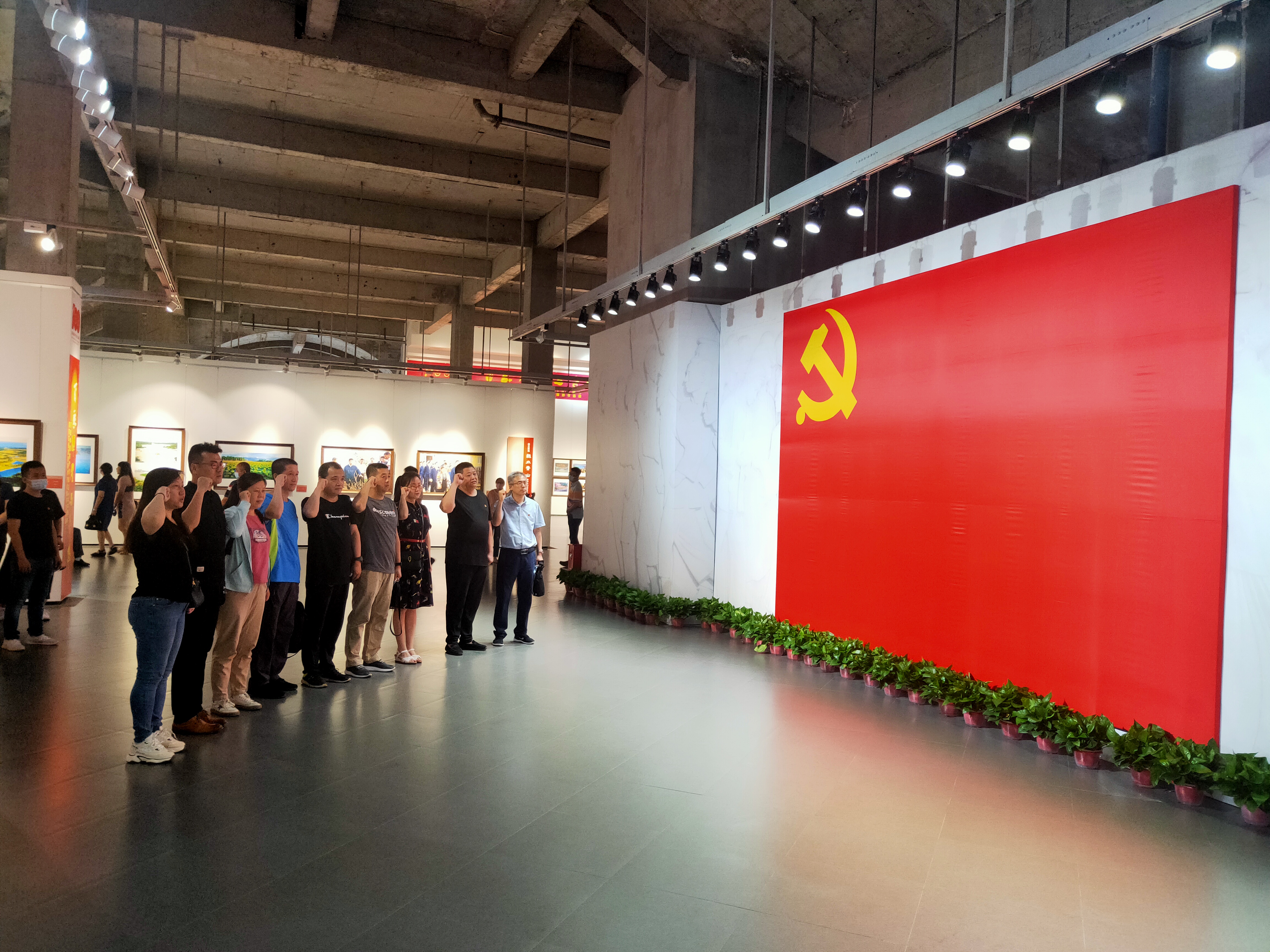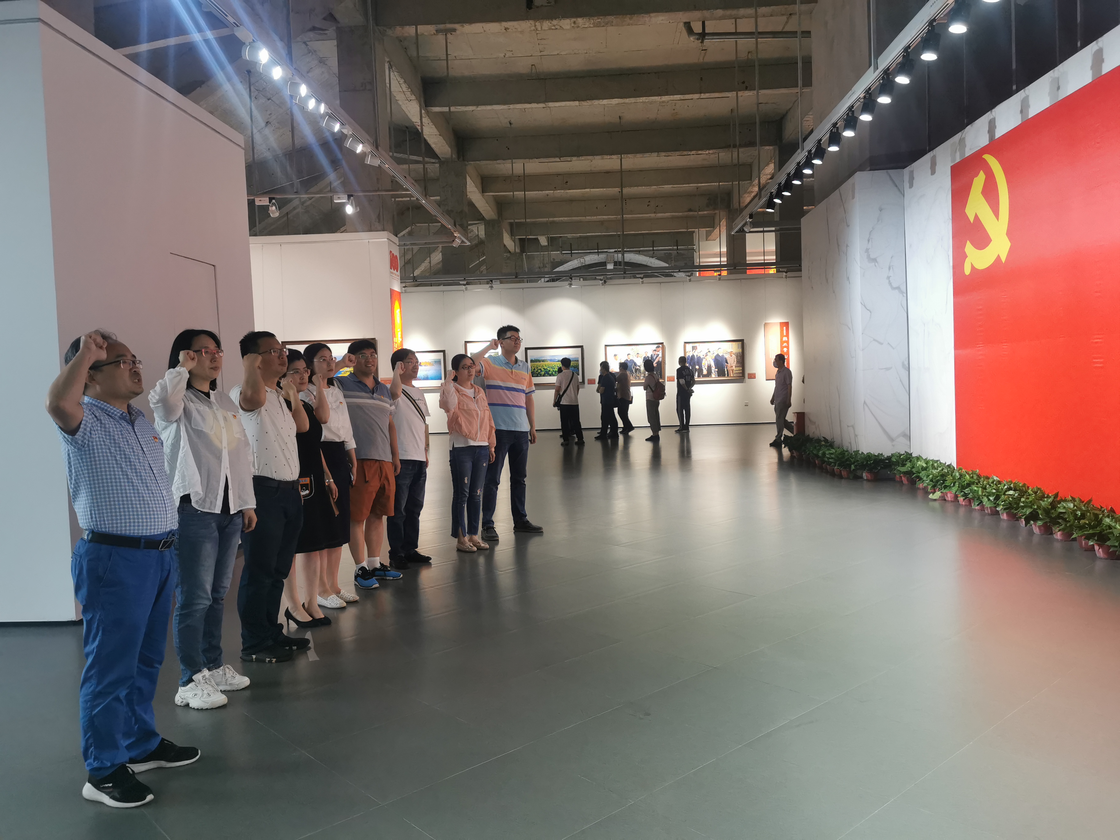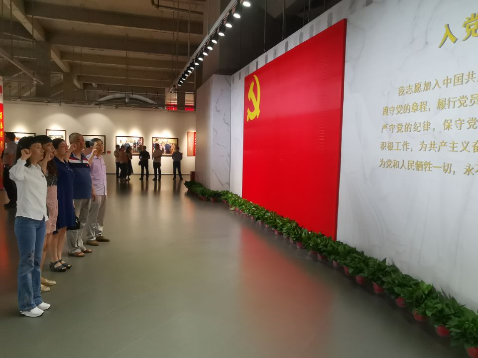 在哈药当代美术馆,大家跟随讲解员的脚步详细参观了庆祝中国共产党成立100周年黑龙江省优秀美术书法摄影作品展,旨在描绘在党的领导下黑龙江各个历史时期的重大事件、人物典型,书写中国共产党人的理想信念和初心使命。随后,党员教师们以支部为单位在庄严的党旗下举起右手,重温入党誓词:“我志愿加入中国共产党……”。重温入党誓词不仅仅是一种追忆、一种传承,更是在汲取一种力量,提醒党员要牢记自己的承诺与使命,提升基层党组织的凝聚力和战斗力,进一步坚定了党员教师们为党的教育事业奋斗终身的理想信念。