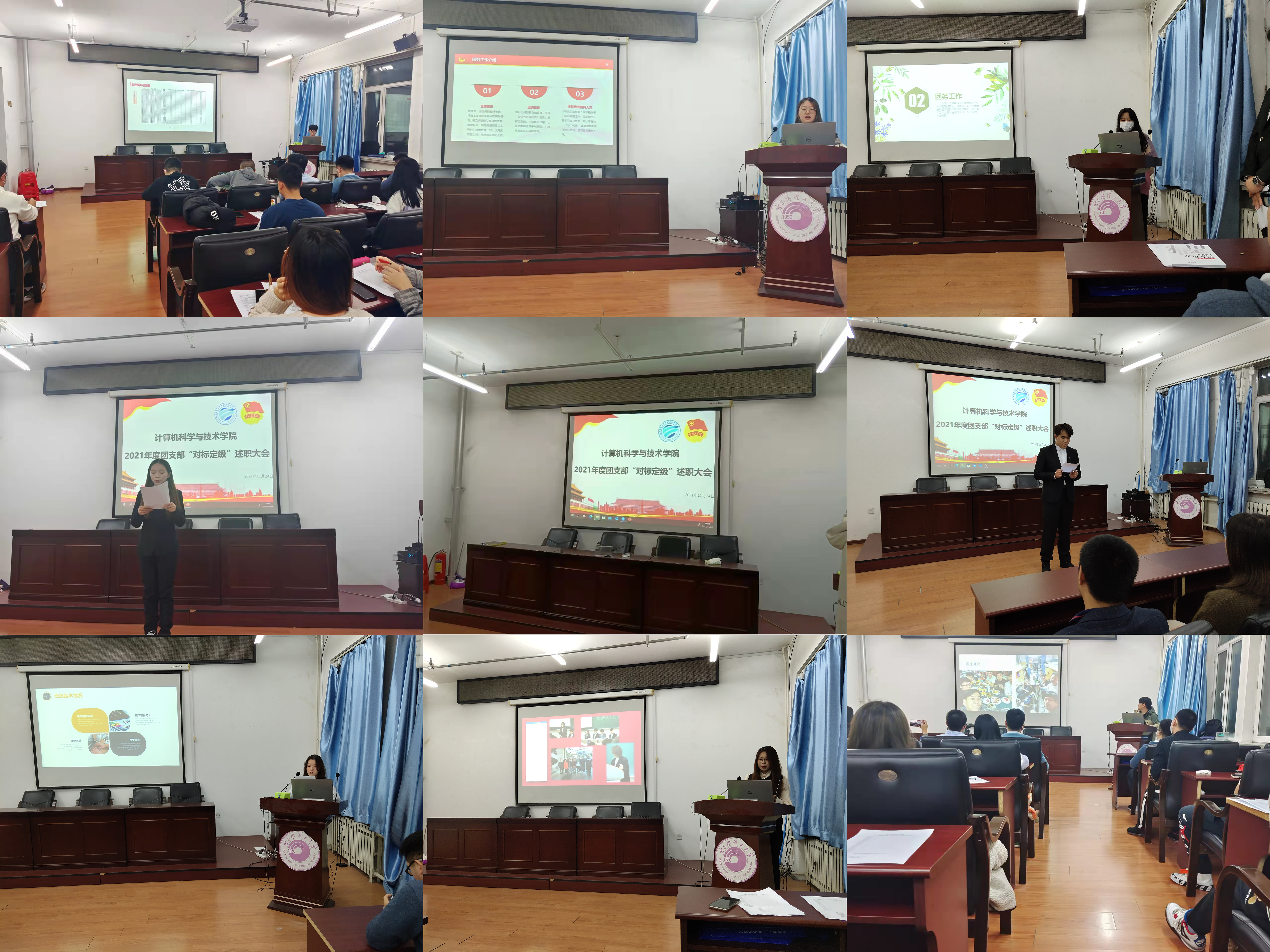 为进一步提升团的战斗能力,落实大抓基层的鲜明工作导向,坚持“一切工作到支部”的理念,充分发挥共青团在立德树人根本任务中的重要作用,依据《基层团组织规范化建设工作实施方案》(中青办发(2019)6号)《团(总)支部对标定级工作指引及操作手册(2021年版)》等文件精神和有关工作要求,计算机科学与技术学院团委于11月24日至25日在E1523,,组织召开了2020-2021年度团支部“对标定级”暨班级建设述职大会。学院团委书记刘鸿图、学生工作办公室主任李博、学生会指导教师梁佳亮、青年志愿者协会指导教师邵明纪、辅导员郭宝鹏、王瑶、孙启智参加了大会。学院2019级、2020级共54个团支部进行了工作述职,2021级各班团支部书记观摩了述职大会。大会通过钉钉平台在2019级、2020级全体学生中进行了直播。