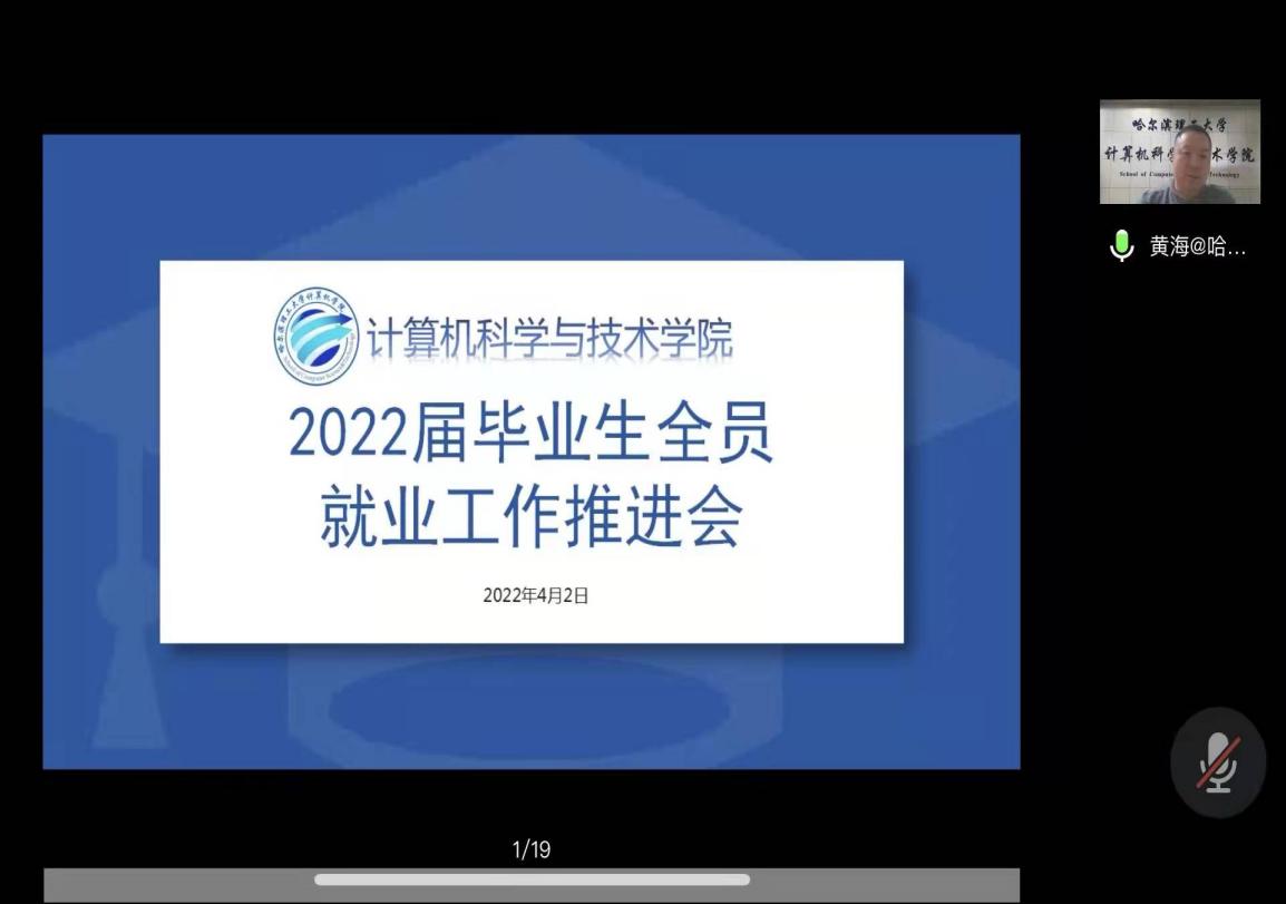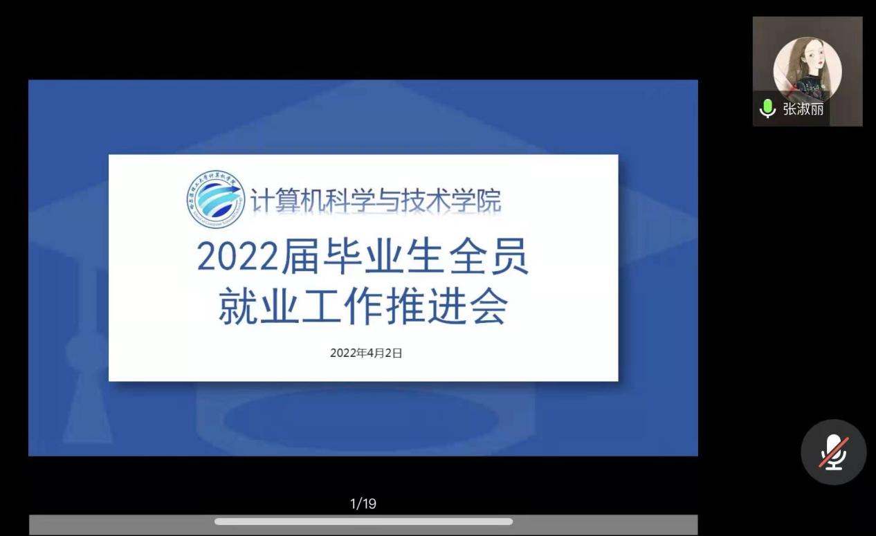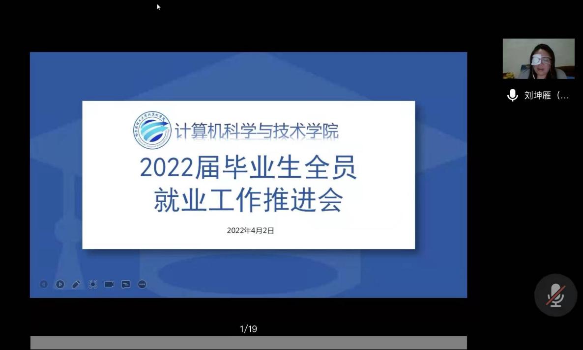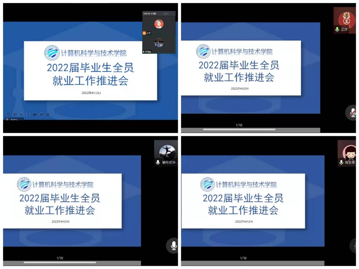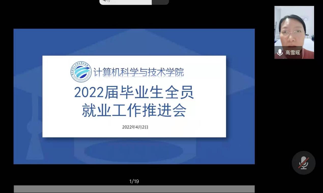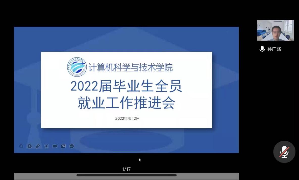 为进一步加强和促进学院毕业生就业工作,推动构建全员就业工作体系,促进毕业生高质量和更加充分就业,分析研判当下就业形势,研讨出台相关就业举措,确保疫情防控期间学院毕业生就业工作稳步推进。2022年4月2日晚19时,计算机科学与技术学院线上召开了2022届毕业生全员就业工作推进会,学院就业工作领导小组成员、全体教师参加会议,学院党委书记孙广路主持会议。