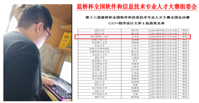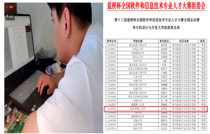 本次比赛各项目具有较大突破。其中,软件工程21-3班王开纪同学(指导教师:于波)获得“C/C++程序设计大学A组”全国一等奖(排名第39),这次我校首次获得此殊荣。21级计算机科学与技术博士张力中同学(指导教师:孙广路)、21级计算机科学与技术研究生刘天宇同学(指导教师:朱素霞)分别获得 获得“C/C++程序设计研究生组”全国一等奖(排名第7)、“Python 程序设计研究生组”全国一等奖(排名第4)。电气工程及其自动化19-16班张泽钰同学(指导教师:陈才)获得“单片机设计与开发”全国一等奖(排名第17)。自动化19-4朱麟超同学(指导教师:陈才)获得“嵌入式设计与开发”全国一等奖(排名第22)。