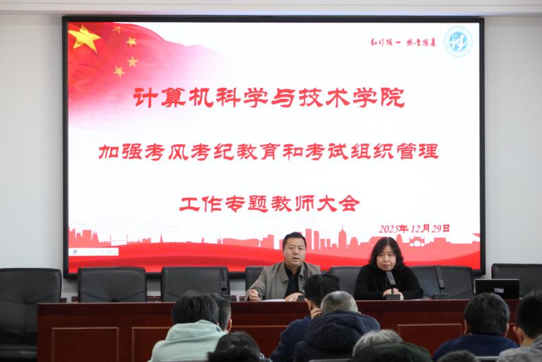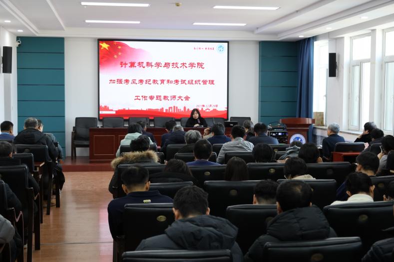 为全面落实学校《关于加强考风考纪教育和考试组织管理的通知》精神,12月29日下午,计算机科学与技术学院在新主楼E1523会议室召开加强考风考纪专题教师大会。本次会议由副院长张淑丽主持,学院领导班子、教务处金胜利及学院全体教职工参加会议。
